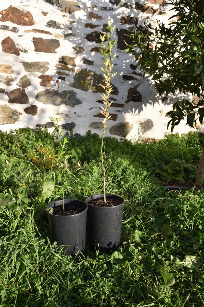 Nous avons commencé la plantation de la forêt comestible en 2018 et nous avons implanté la pépinière sur une nouvelle parcelle en 2021. Les plantes sont issues en partie des plantations de la forêt jardin. Les plantes aquatiques proviennent de notre mare et de la piscine naturelle. Nous testons aussi la rusticité des agrumes en pleine terre.